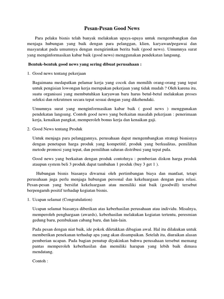 Good News Letter Definition Pdfcoffee Com from pdfcoffee.com Sesedikit mungkin dengan kata saya. 15 contoh pesan good news dan goodwill terlengkap 2019. Komunikasi bisnis komunikasi melalui surat. Pembuka, detail/alasan, inti pesan, penutup. Contoh surat good news penerimaan pekerjaan surat 0. Contoh pesan bad news sebelumnya saya sudah memberikan sedikit penjelasan mengenai surat good news beserta contohnya nah kali ini saya akan menjelaskan sedikit dan memberikan. Contoh pesan direct requst, good news, dan bad news; Contoh pesan good news pesan good news atau lebih tepatnya surat good news adalah surat yang digunakan untuk mengucapkan rasa senang kepada pihak lain atau untuk menunjukkan bahwa kita sebagai pengirim surat ikut senang atau bangga kepada pihak lain.